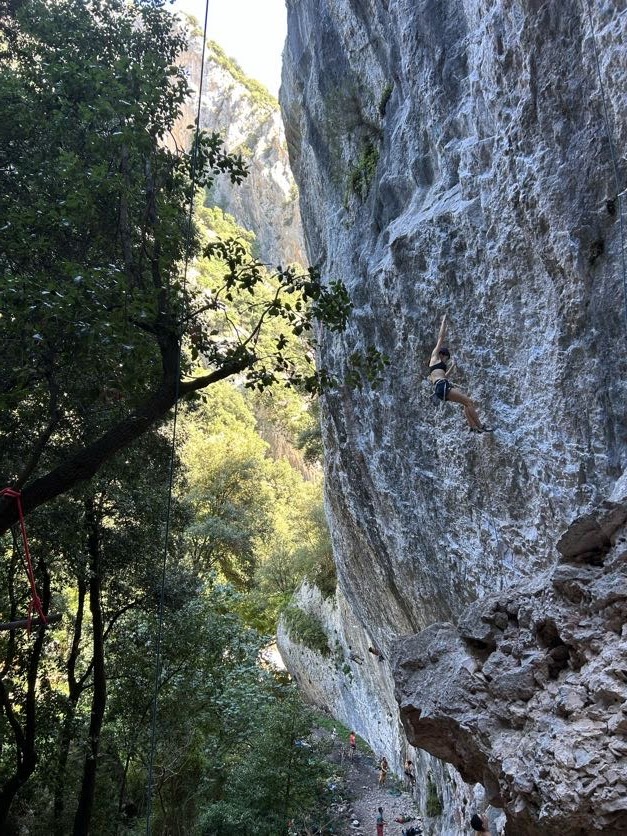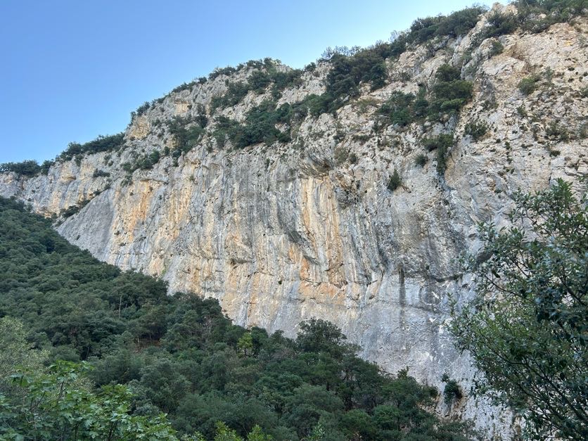 Début septembre 2025, on a prévu d’aller grimper dans les Alpes italiennes. Malheureusement les prévisions météo nous jouent des tours. On préfère assurer le coup, on part grimper en Espagne ! Un ami m’avait parlé de Sadernes, une falaise proche de Gérone, en Catalogne. C’est pas loin de la frontière (1h) et ça semble pas mal. On glane des infos à droite à gauche, sur le site de Gratteron et Chaussons et sur The Crag. Il y a des voies de tous les niveaux, on peut y grimper l’été à l’ombre et il y a des rivières pour se rafraîchir. Banco !